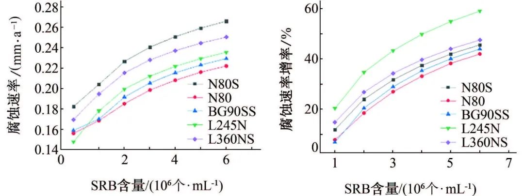 图3 高压条件下各试验钢在含不同量SRB模拟溶液中的腐蚀速率及其增率