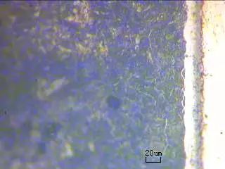 (2)检测零件氮碳共渗盐浴复合处理后的硬度,首先测试表面硬度,三个硬度值分别为896.51HV0.1、918.93HV0.1、907.59HV0.1,平均硬度值为907.68HV0.1。对断面用4%的硝酸酒精溶液腐蚀,金相显微镜400×下观察可知化合物深度为20μm左右,见图1,检测断面梯度硬度,整个硬化层大约为0.5mm,见图2。