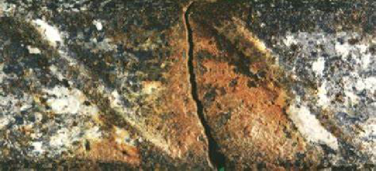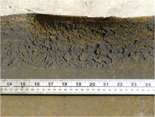 流动诱发局部腐蚀:由台地侵蚀发展而来,流动会诱使台地侵蚀区形成凹沟,平行于物流方向的刀线槽沟。
