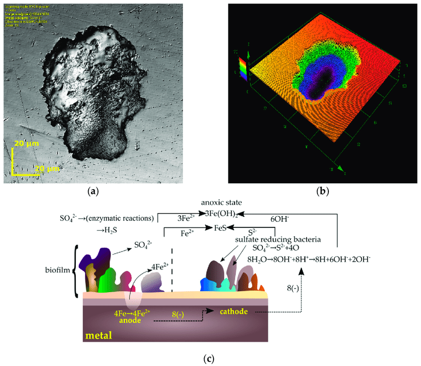 SRB在金属表面的生长繁殖过程及其代谢产物,会影响其对金属腐蚀速率和电化学反应机理。SRB与金属的相互作用主要以加速腐蚀或影响腐蚀为主,形态主要表现为局部腐蚀(如孔蚀、缝隙腐蚀、沉积物垢下腐蚀等),同时会出现电偶腐蚀加速、环境敏感断裂等形式。
