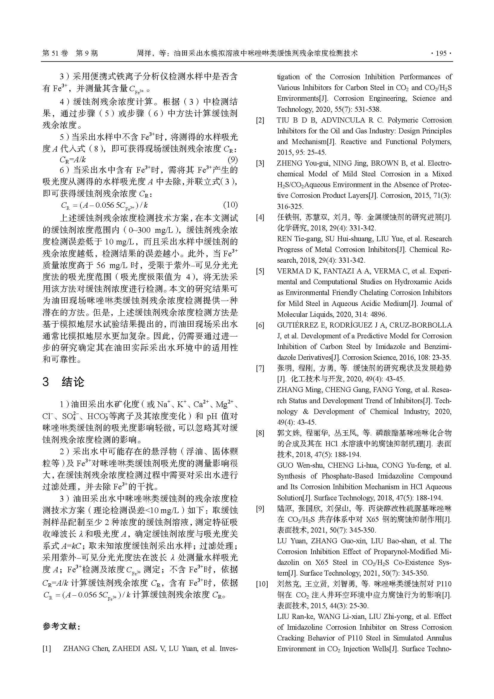 油田采出水模拟溶液中咪唑啉类缓蚀剂残余浓度检测技术