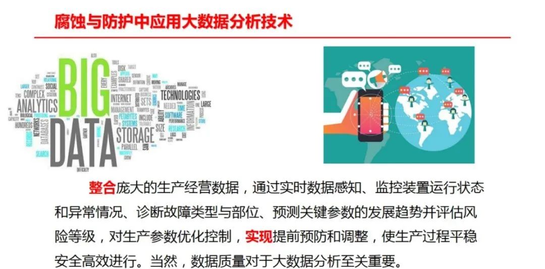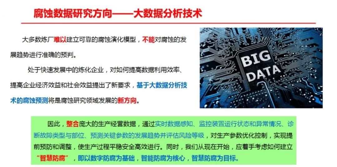 近年来,国内一些研究机构(如青岛安工院)开发了一套集在线、离线监检测数据于一体的为腐蚀分析提供便利的腐蚀数据管理系统,其次运用深度学习方法对炼化企业累积的海量数据进行深度分析,关键装置的工艺参数和水质分析数据进行学习训练,建立关键信息与其他监测之间的黑盒模型,达到根据工艺状态快速、准确的预测目的,为指导企业腐蚀防护工作奠定理论和技术基础。