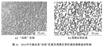 某批次TC6叶片在抛光后发现“白斑”形貌(见图10)。对“白斑”区域和周围正常区域进行金相检验,结果如图11所示。由图11可知,“白斑”区域和周围正常区域均为等轴组织。