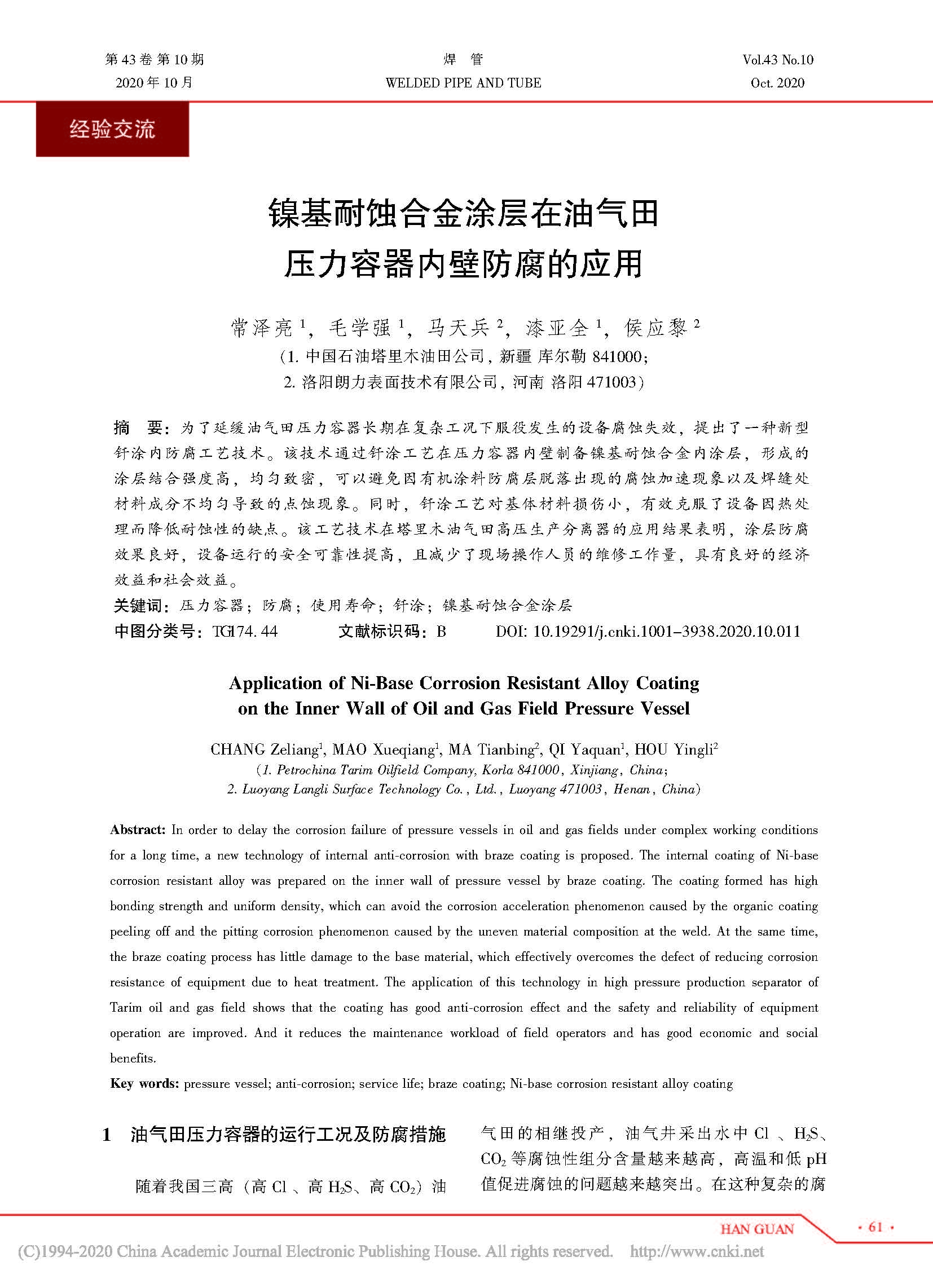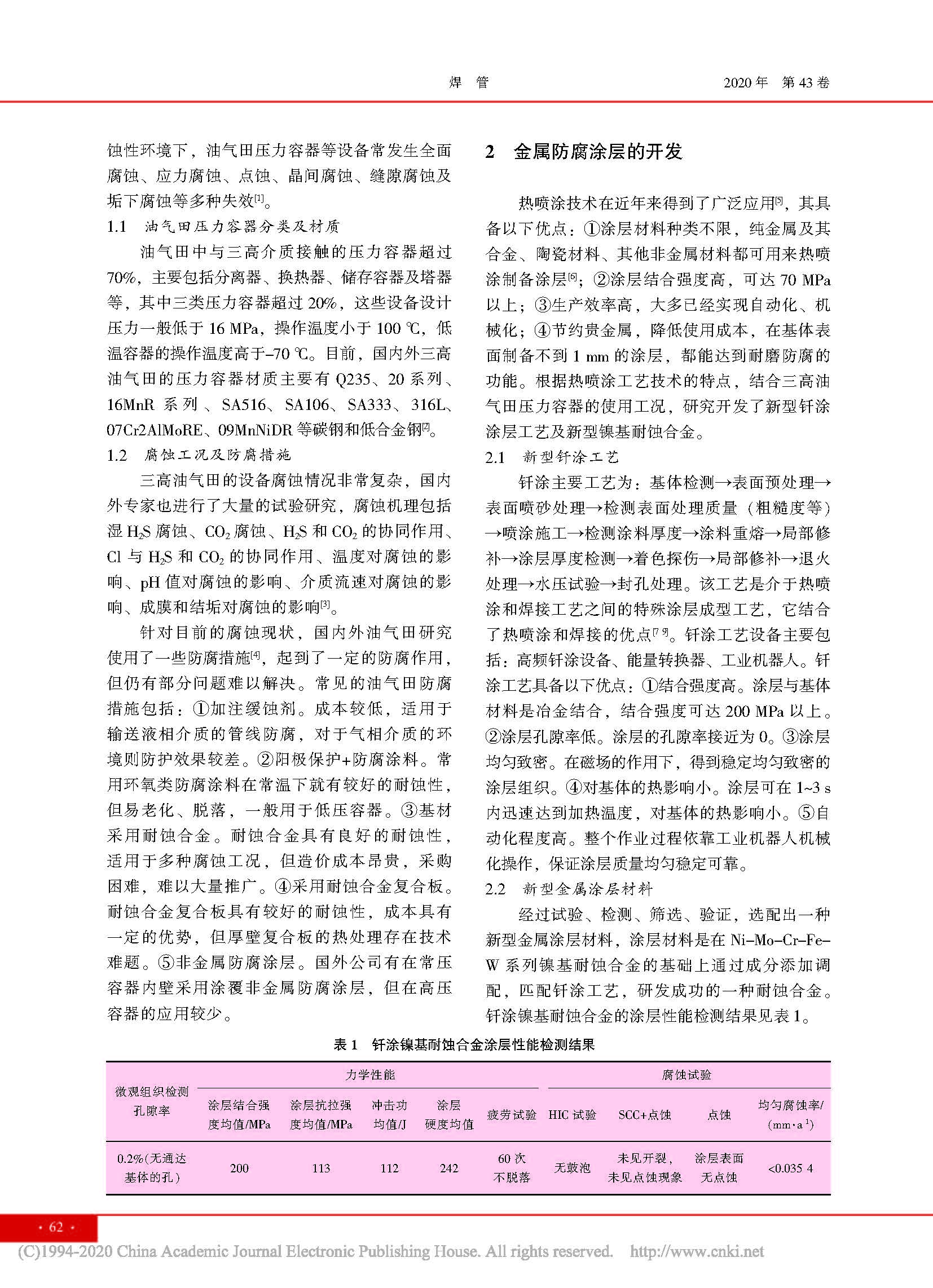 镍基耐蚀合金涂层在油气田压力容器内壁防腐的应用