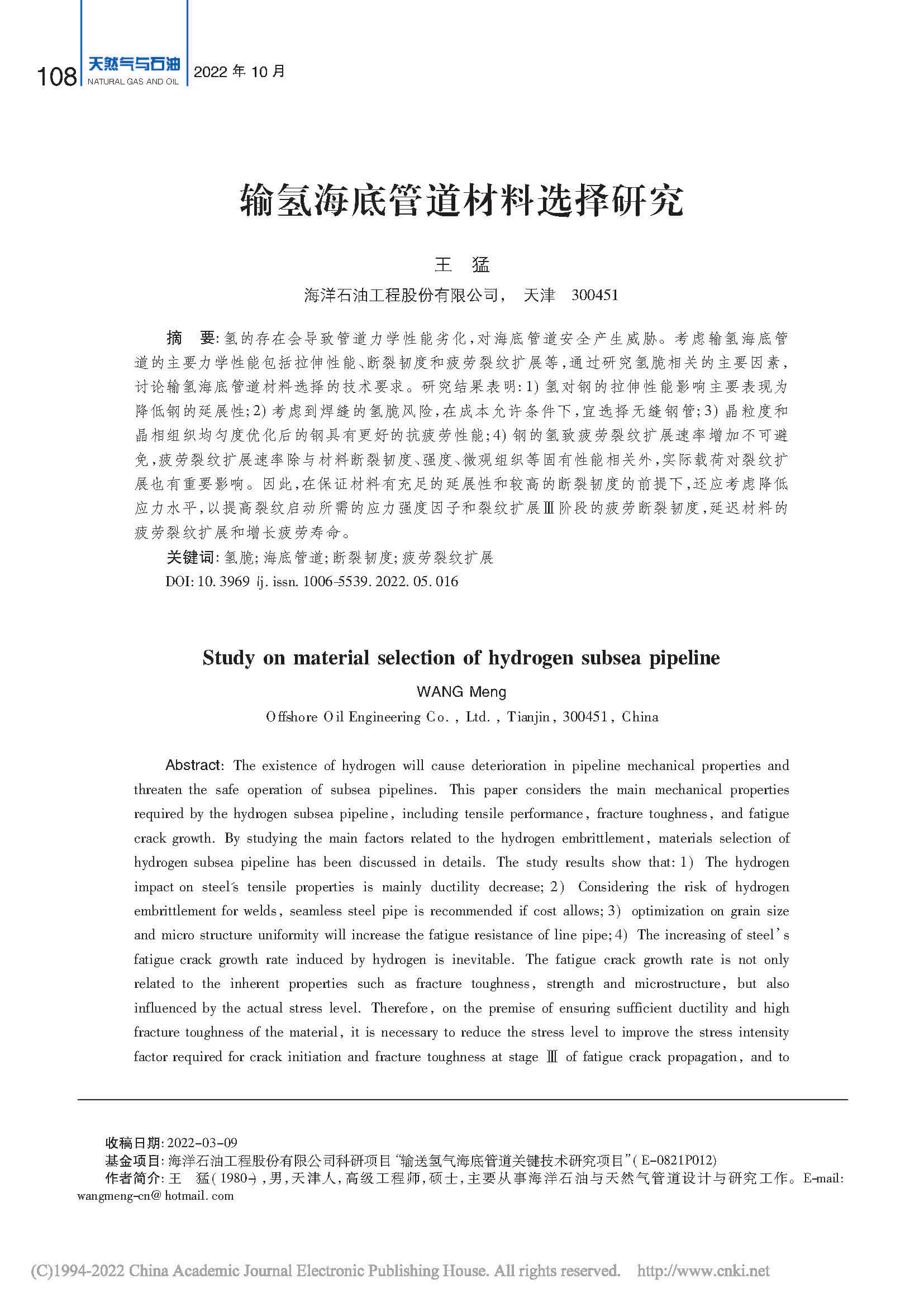 我国首条输氢海底管道选材初探