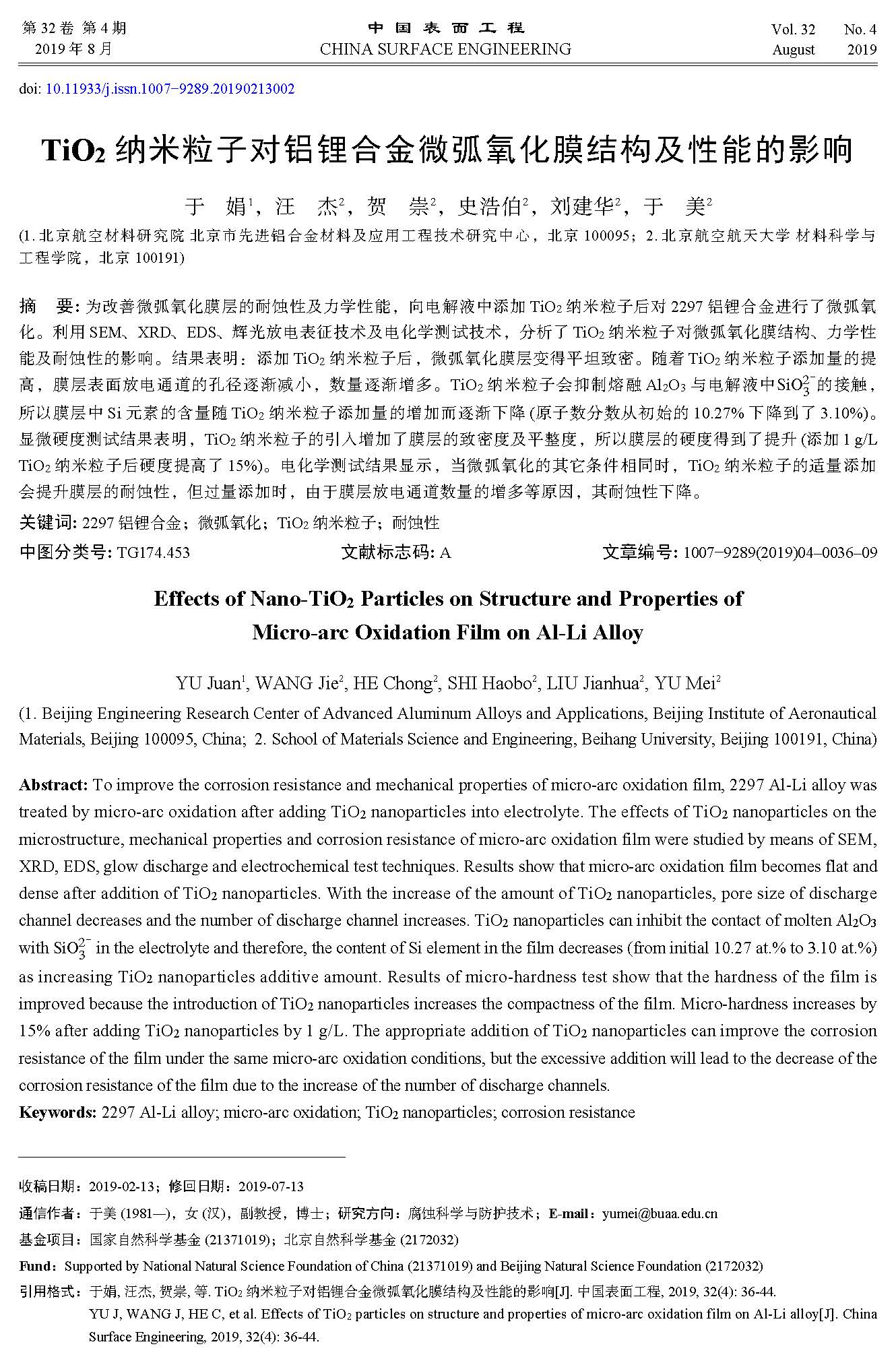 TiO2 纳米粒子对铝锂合金微弧氧化膜结构及性能的影响