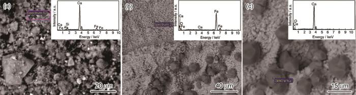Fig.5 Microstructures and EDS pattens of spalling corrosion products on the surface of cement mortar covered rail outer (a) and inner (b) and inner dark globule (c)