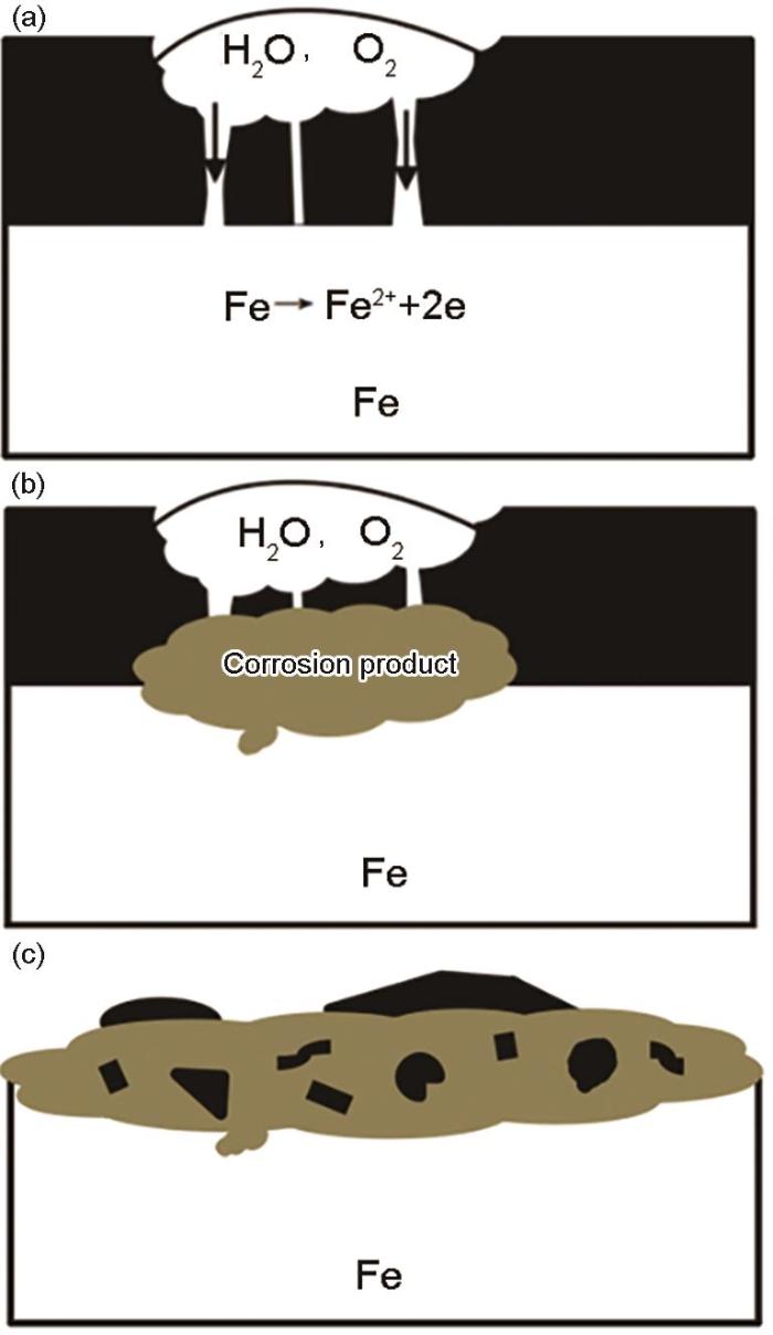 Fig.8 Schematic diagram of rail corrosion in humid air environment: (a) water and oxygen contact the substrate through the oxide layer on the rail surface, (b) substrate under the oxide layer is corroded, (c) toxide layer is gradually converted into the rust layer
