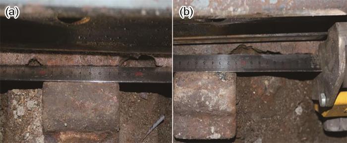 图7给出了某线路两根杂散电流腐蚀钢轨底脚掉块伤损宏观形貌。伤损轨位于两个站点区间的上行线隧洞分叉处,类似人防门建筑,顶部有漏水,该部位是盾构和明面开挖相结合的部位,易发生漏水情况,漏水进一步造成泥沙在钢轨底部淤积导致对地绝缘失效。可以看出,轨底掉快部位扣件锈蚀严重,钢轨与轨枕间充满已经固化的泥浆,伤损均在钢轨内侧扣件处,左股出现2处,尺寸分别为20 mm×15 mm、42 mm×16 mm (图7a);右股掉块伤损严重部位120 mm×15 mm,较轻微部分还有约45 mm长 (图7b)。从现场环境、掉块形貌、钢轨对地绝缘状态等方面,可推断此钢轨的伤损是杂散电流腐蚀导致,其腐蚀速率与杂散电流的大小有关。
