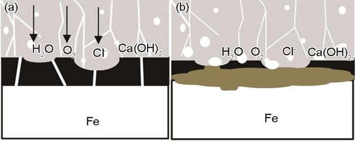 Fig.10 Schematic diagram of rail corrosion of cement covered environmental: (a) corrosive ions, oxygen and water contact the rail surface through concrete, resulting in comprehensive corrosion of the oxide layer and substrate, (b) the corrosion products at the junction of substrate and oxide layer are γ-FeOOH and spherical Ca(OH)2