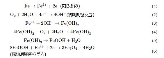 污水中的SO42-与Fe2+结合,FeSO4水解形成氧化物和游离的硫酸,硫酸又加速钢的腐蚀,新得到的FeSO4再次水解生成新的酸[20],如反应式 (12~13)。