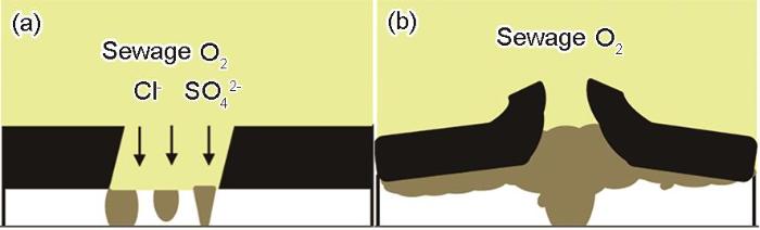 Fig.9 Schematic diagram of rail corrosion in sewage immersion environment: (a) corrosive medium containing chloride ion and sulfate radical reacts with the oxide layer and substrate at the defect site of the oxide layer, (b) concentration of stress in the rust layer produces local bubbling