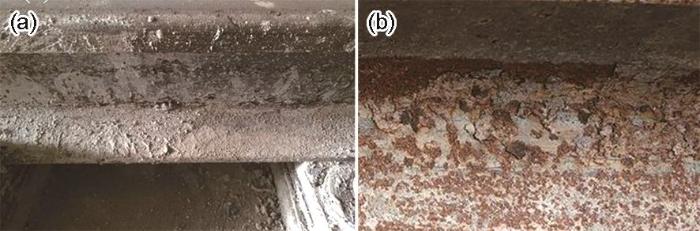 Fig.2 Macro morphologies of rail bottom (a) and immersed rail (b) in sewage immersion corrosion environment