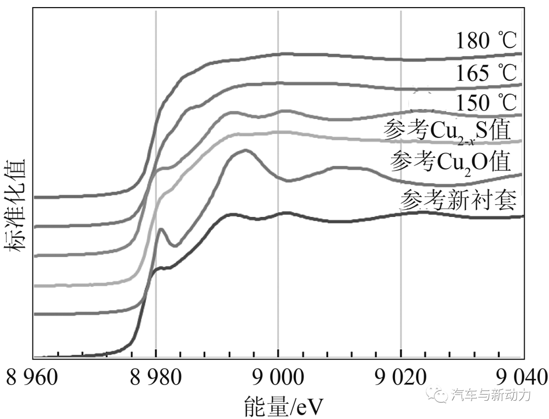 (1)部件腐蚀试验。为了确定ZnDTP分解对铜硫化腐蚀的影响,通过部件腐蚀试验,研究人员验证了试验温度对ZnDTP分解的影响。然后,研究人员通过扫描电子显微镜-电子探针显微分析仪(SEM-EPMA)对部件表面形成的腐蚀产物和中间产物进行了分析,确定了它们的组成成分,并利用X射线衍射(XRD)、X射线近边吸收结构谱(XANES)和X射线吸收精细结构谱(EXAFS),确定其化学结构详细情况。