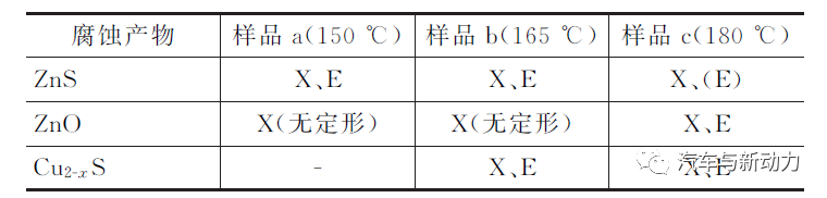 表2显示样品中硫化锌和硫化铜等腐蚀产物的存在情况。在出现腐蚀之前(样品a),硫化锌吸附在铜衬套表面,硫化锌和硫化铜在初始腐蚀阶段(样品b)共存,然后硫从硫化锌中析出,产生了硫化腐蚀产物Cu2-xS。在样品c后期的腐蚀阶段,硫化锌消失,仅存在Cu2-xS。这表明存在的硫化锌作为中间腐蚀产物,硫化锌中的硫析出供给给铜,产生Cu2-xS。