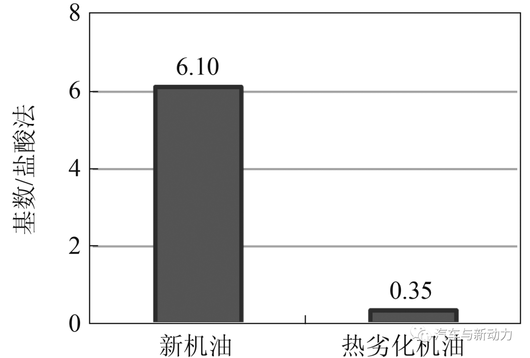 烧杯内还有1个搅拌器,可以搅动机油。在温度180 ℃、搅拌时间100 h、抽油量250 mL、转速1 300 r/min的试验条件下,研究人员制备了热劣化机油,并假定ZnDTP的残存率为零。采用红外(IR)光谱法比较热劣化机油与新型机油的ZnDTP光谱强度,确认ZnDTP残存率。图4所示为ZnDTP残存率,通过酸碱滴定法(JISK2501)计算残留清洁剂量的基数。图5所示为试验油基数比对。从图5可以看出,随着ZnDTP的热分解,残留的清洁剂量大幅减少。因此可以推断,由ZnDTP热分解产生的中间产物与清洁剂会发生反应。