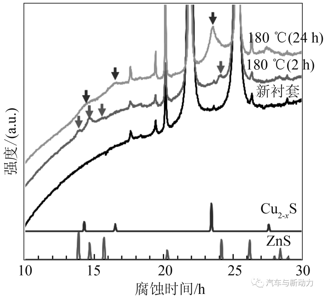 研究人员在表1条件下进行试验后,观察到衬套横截面结果如图7所示。样品a在试验温度150 ℃条件下,横截面没有肉眼可见的腐蚀迹象;样品b在试验温度165 ℃条件下,发现有微弱的腐蚀层形成迹象;样品c在试验温度180 ℃条件下,能够看到约10 μm厚的腐蚀层,这表明腐蚀对温度有敏感性;样品d的试验时间比样品c短,与样品b一样,发现有微弱的腐蚀层形成迹象。在此,研究人员将形成微弱腐蚀层的样品b和样品d定义为初始腐蚀阶段。另一方面,在使用热劣化机油样品e的试验中,横截面显示没有腐蚀迹象。这表明,由于热劣化,ZnDTP中的硫已经在机油中形成化学性质更稳定的化合物。这是由于发动机机油中添加CaCO3作为清洁剂,从ZnDTP中分离的硫与CaCO3反应形成更加稳定的中性产物(CaSO4)。确定初始腐蚀阶段的产物对阐明腐蚀反应路径很重要。研究人员采用EPMA进行样品b的横截面分析(初始腐蚀阶段)。图8为EPMA 显示结果。经证实,铜衬套表层存在硫,这源于硫化腐蚀层,同时证实了铜衬套表层存在少量的锌。研究人员推测,锌是腐蚀反应路径的中间产物,并采用XRD来探明锌化合物的晶体结构。图9显示了部件在腐蚀试验(样品c和样品d)后,铜衬套表面腐蚀产物与腐蚀时间的XRD相关性结果。在初始腐蚀阶段,铜衬套表面出现基于硫化锌的衍射峰值。在样品c中,研究人员虽然发现作为硫化腐蚀产物Cu2-xS的衍射峰值,却没有发现硫化锌的衍射峰值。这表明,硫化锌作为铜衬套硫化腐蚀的中间产物,有助于腐蚀反应的发生。