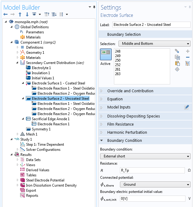 在腐蚀分析中,我们经常研究的腐蚀表面所具有的电气连接可不像控制电流或电压那么简单。相反,电极表面可能直接短路连接到另一个电极,例如单桩与过渡连接件之间的电气连接。在这篇文章中,我们将讨论如何在 COMSOL Multiphysics® 软件中使用适当的边界条件来描述这些电极和外部短路。