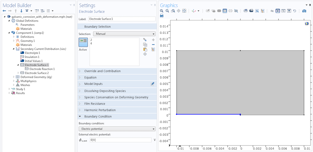 上图取自电偶腐蚀造成电极变形案例。在此模型中,我们通过应用外部电位设为 0 V 的“电极表面”边界条件,将镁和低碳钢定义为电接触。