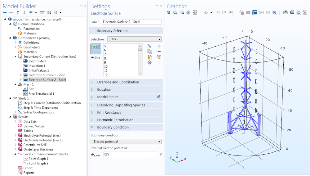 当我们在 COMSOL Multiphysics 模型中定义牺牲阳极时,可以使用与上述理想化电偶腐蚀示例相同的方法,牺牲阳极和受保护钢表面上的电位均设为 0 V。下面,我们看看阴极保护的阳极膜阻效应案例中的钢制平台分析模型。在此模型中,我们定义的钢表面具有与上节所述相同的外部电位条件。