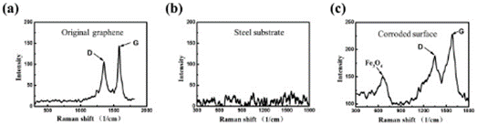 图6. 石墨烯(a)、钢衬底(b)、浸泡24 h腐蚀表面(c)的拉曼光谱