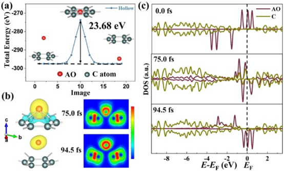 进行能垒、CDD、ELF和pDOS计算,可对相互作用机理进行分析。图a中能量势垒为23.68 eV,显示了在接近环形中空部位的过程中AO上的持续排斥力。这种能量势垒解释了Ek从46.0 fs降低到75.0 fs,以及在AIMD模拟中散射后Ek的增加。根据图b,我们发现当AO在75.0 fs处到达离中空中心最近的位置并在94.5 fs处逃逸时,电子转移较少集中在AO和石墨烯之间,这表明它们之间的结合较弱。图c中的pDOS计算也表明环中空部位AO的结合条件较差。总之,由于环中空部位的强排斥力和弱键合条件,AO在撞击环中空部位后最终被分散。