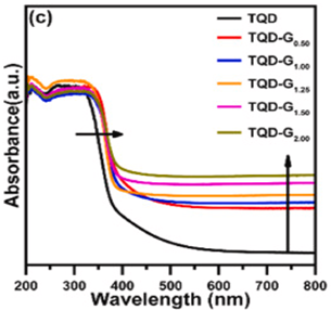 如图所示,TQD从400 nm开始具有吸收边缘。即使是量子尺寸,TQD带隙为2.78 eV。如此小的带隙原因是N掺杂到TQD中,在TQD的价带边缘附近产生局域态,从而将吸收边缘延伸到可见区域中。后面XPS分析也证实了TQD中存在N掺杂。此外,通过石墨烯的添加,光学吸收明显增强,带隙减小。