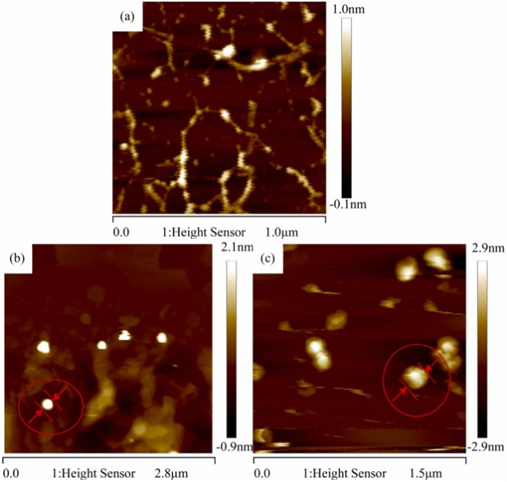图4. 石墨烯(a)、Cu@石墨烯(b)、Ni@石墨烯(c)的AFM图像