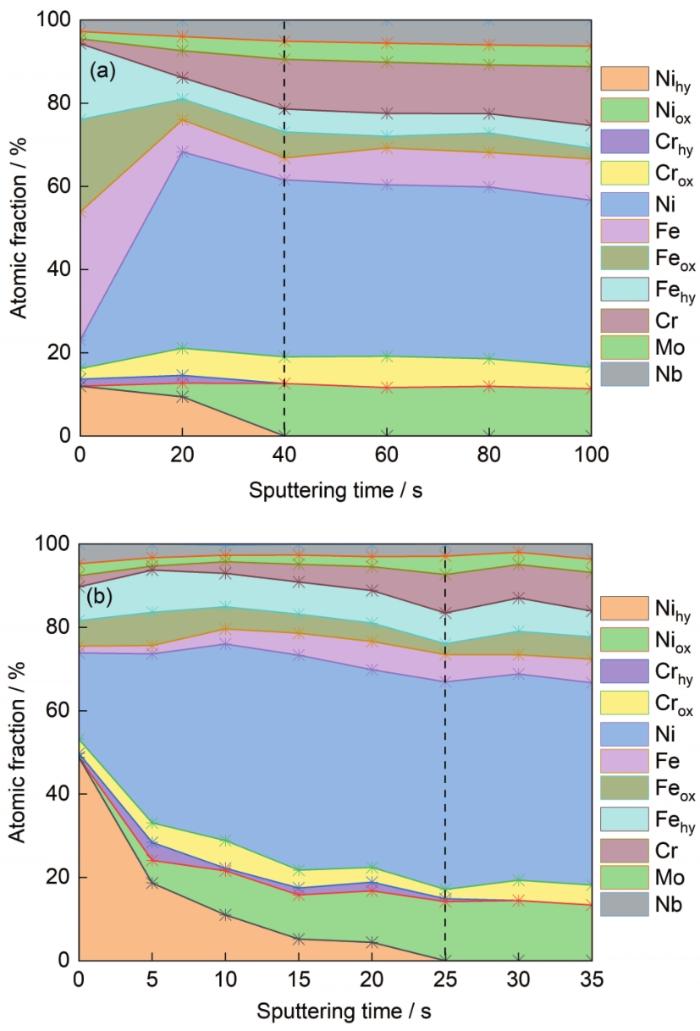 图10是2种合金表面钝化膜中Ni、Fe、Cr、Mo、Nb和O的深度分布。可以看出,Ni、Fe和Cr含量随溅射时间增加而增加。与R Inconel 718合金相比,SLM Inconel 718合金形成钝化膜的表层具有更低的Ni、Fe和Cr含量以及较高的O含量,表明SLM Inconel 718合金形成的钝化膜更厚[37]。