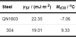 表4 QN1803和304不锈钢的堆垛层错能(γSF)、形变量30%时产生50%马氏体的转变温度(Md30)