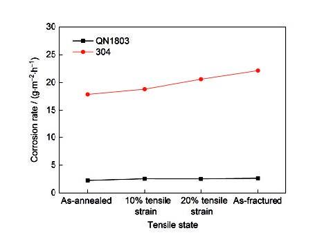 图16   QN1803和304不锈钢不同拉伸形变量下的硫酸腐蚀速率