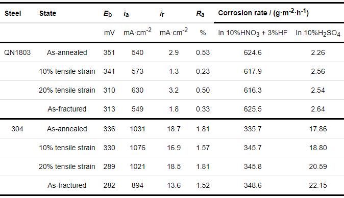 QN1803和304不锈钢在不同拉伸形变条件下的腐蚀实验结果如表3所示。QN1803和304不锈钢的点蚀电位随拉伸形变量增大而呈下降趋势,其中QN1803不锈钢的点蚀电位从原始冷轧退火态的351 mV下降到拉断时的313 mV,下降了38 mV;304不锈钢从336 mV下降到282 mV,下降了54 mV。晶间腐蚀敏感性是通过Ra (ia / ir)半定量地分析计算得到的,其中ia是正向阳极扫描过程中的活化电流密度峰值,ir是反向扫描过程中的再活化电流密度峰值。不同种类的不锈钢对实验介质的耐腐蚀能力不同,在DL-EPR实验中的电流密度峰值也不同。当电流密度峰值不同时,比较Ra值没有意义,因此DL-EPR实验结果仅用于比较同种不锈钢在不同拉伸形变状态下的晶间腐蚀敏感性。在10%HNO3 + 3%HF腐蚀介质中,QN1803不锈钢的耐晶间腐蚀能力弱于304不锈钢。随着拉伸形变量增加,2种不锈钢的耐晶间腐蚀能力变化不大。在10%H2SO4均匀腐蚀介质中,QN1803不锈钢的耐硫酸腐蚀能力约为304不锈钢的8倍。经拉伸形变后,2种不锈钢的耐硫酸腐蚀能力均出现下降趋势。拉断态的QN1803不锈钢硫酸腐蚀速率为2.64 g/(m2·h),相比原始退火态的2.26 g/(m2·h)硫酸腐蚀速率退化了16.8%;304不锈钢的硫酸腐蚀速率退化幅度达到24.0%,这表明304不锈钢耐硫酸腐蚀性能受拉伸形变的影响更为显著。