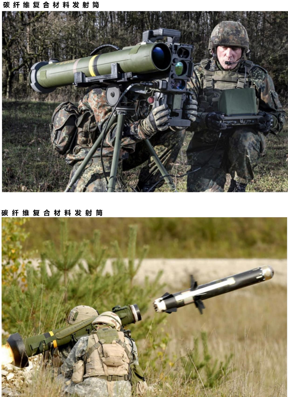 在导弹发射时,传统的机械打开盖与爆破盖有重量大、打开反应时间慢和维修费用高等缺陷,鉴于碳纤维复合材料轻质高强、抗腐蚀等优点,采用复合材料发射箱盖代替传统发射箱盖可以解决这些问题。采用碳纤维增强复合材料制造发射箱箱体,可以很好的解决金属结构箱体存在的重量大、焊接变形、易锈蚀等诸多问题。采用复合材料制造发射箱,可以将结构做得非常简单、紧凑,使弹箱质量比远小于1,同时提高了导弹贮存和运输效率,相比金属材料有更高的设计自由度。碳纤维复合材料便携式导弹发射器主要用于单兵便携作战,武器系统结构紧凑,外形尺寸小,携带重量轻。对发射器的主要性能要求是:a)导弹采用的是筒式发射方式,发射器必须是薄壁圆筒形截面结构。c)要求身管对导弹具有足够的锁定强度,密封性好,透湿率、轴向变形要小。d)发射器,导弹,安全锁,一、二号电气接插件,压力调接阀,闭气膜,呼吸膜,前、后密封缓冲组件等组合构成武器系统。发射器为零部件提供了安装基准。基于上述要求,碳纤维/玻璃纤维增强树脂基复合材料是发射器身管材料的首选方案。这样的身管方案具有结构紧凑、重量轻、强度高、刚性好、便于生产的特点。 按照发射器的强度和结构要求及纤维缠绕的特点,身管的结构采用螺旋缠绕和环向缠绕相结合的方式,以便发射器身管的径向、轴向强度和刚度满足综合性能要求。管身螺旋缠绕角度为35°,环向缠绕角度为 90°,螺旋循环数为 96 次,根据确定的螺旋缠绕角、缠绕方式、缠绕顺序以及螺旋和环向缠绕层数进行发射器身管的强度计算。 采用碳纤维/玻璃纤维增强复合材料研究导弹发射器身管,发射器重量轻,强度高,刚性好。碳纤维是弹箭复合材料发射器轻量化研究的首选材料之一。碳纤维导弹发射器身管的透湿率、轴线变形、锁弹强度、密封性能可以满足导弹发射器的设计要求,同时还具有电磁屏蔽的作用。发射简采用纤维增强复合材料,可以很好地解决金属结构筒体存在的重量大、焊接变形、易锈蚀等问题,是未来主要发展趋势之一。 发射筒筒体结构设计主要根据导弹外形结构、弹翼分布、导弹在筒内的支撑与导向方式以及其他使用要求进行。筒体截面形状为圆形,发射筒内壁需能耐受高温燃气流冲刷和多次使用要求,筒内壁选用了金属内衬,外层承载结构采用碳纤维/环氧树脂复合材料,考虑到筒前端受到较大的冲击载荷,发射筒前、后法兰选用高强铝合金,筒体设计有前、后吊装箍,保证发射筒的起吊和放置,吊装箍为高强铝合金材料。发射筒筒体由金属内衬、复材结构层、前法兰、后法兰、环筋、前吊装箍、后吊装箍等组成。复合材料发射筒以钢内衬为芯模,外缠碳纤维/环氧树脂复合材料为结构层,在一定温度下高温固化成型。复合材料发射筒采用自动化设备连续纤维成型工艺简便且材料制造和制品成型同时完成,体现了复合材料制品的材料、设计和制造三者间的密切关系。 M3“卡尔·古斯塔夫”在战场上的优异表现,美国陆军决定大规模采购装备这一瑞典制武器。2014年,瑞典萨博公司推出了M4新型反坦克火箭,M4重6.7KG,较卡尔·古斯塔夫M3轻约3KG,外壳采用碳纤维复合材料(减重0.8KG),通过重新设计文丘里管使火箭炮减重0.9千克,M4的总长度减到了1米以内。超轻型迫击炮研制时间也是从2015年就已经开始,正好与某超轻型120毫米迫击炮的总设计师讲述的“2015年我又担任了轻120迫击炮的总设计师”相吻合,估计其定型名称或许可能叫15式“轻120迫击炮”,从目前公开的信息,此迫击炮与美国洛克希德导弹与宇航公司已用碳纤维复合材料制造了一种120毫米迫击炮管一样,高性能碳纤维用作迫击炮身管外部增强层缠绕,内部采用Ni₂或者钛合金炮钢材料做内衬(未来有可能使用更轻的M46碳纤维方案),既大大降低了重量,又避免了完全使用碳纤维的引起的高温烧灼问题,也便于分成两节。