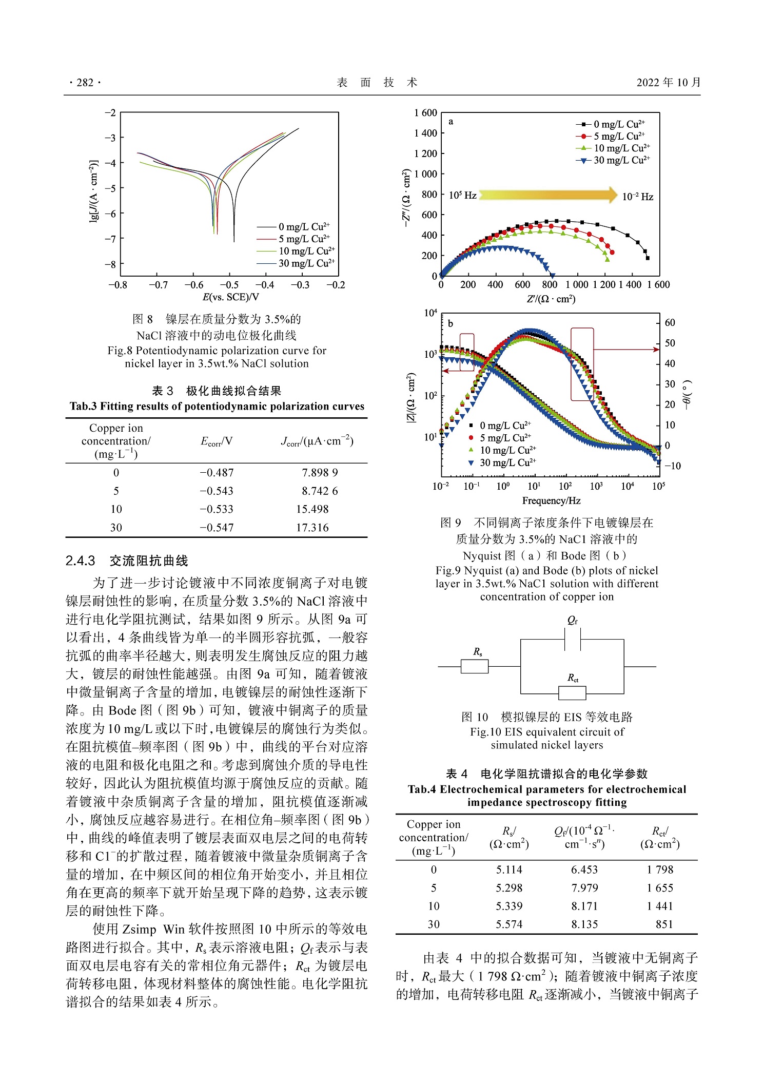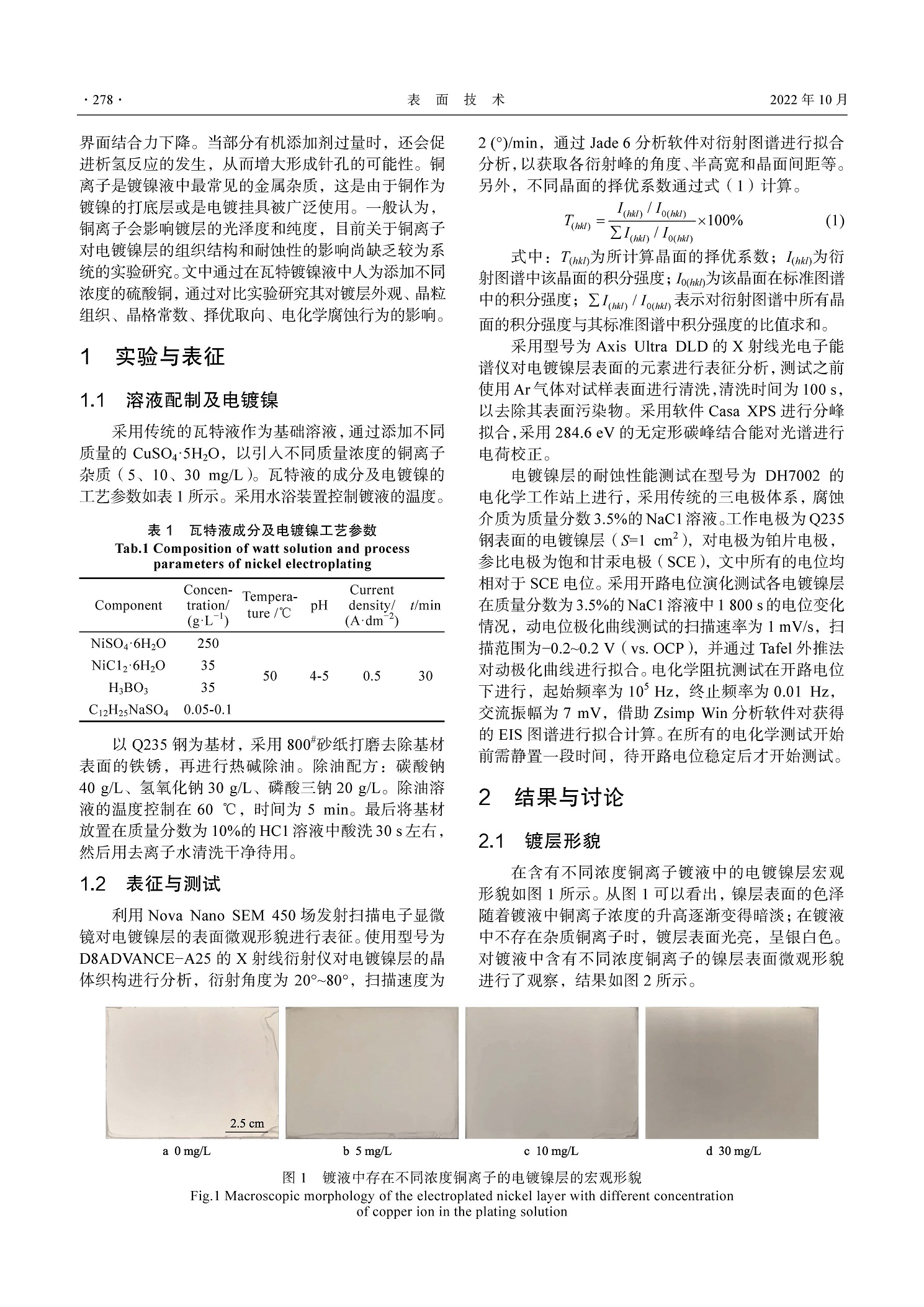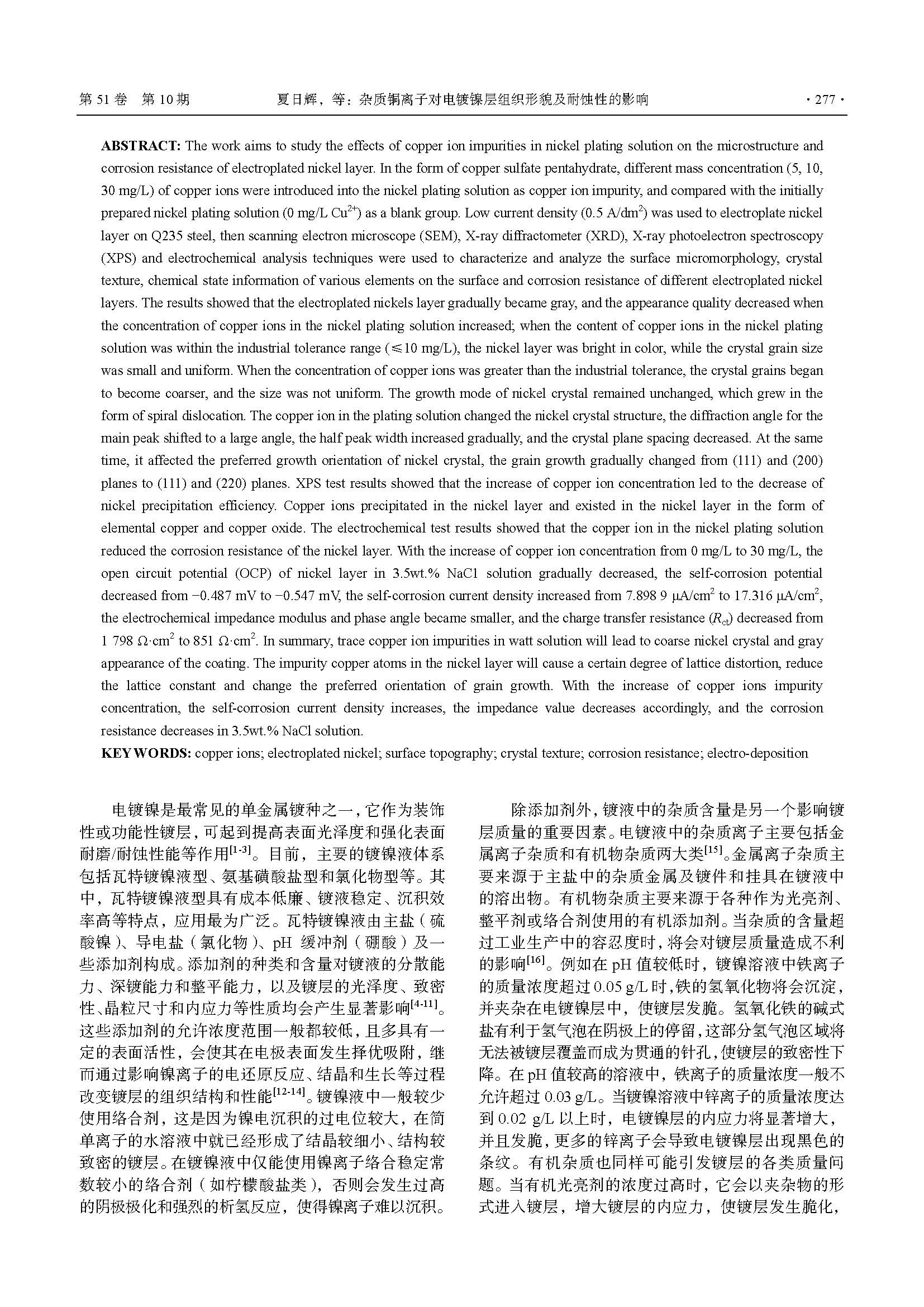 杂质铜离子对电镀镍层组织形貌及耐蚀性的影响