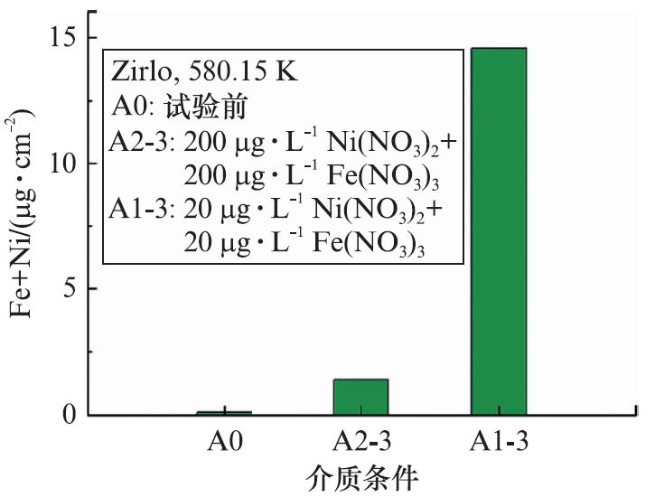 除了对燃料包壳表面CRUD沉积产生直接影响的pH、溶解氢、注锌三种水化学因素,Fe/Ni腐蚀产物浓度、锆合金燃料包壳材料表面性能这两种与水化学相关的因素也对CRUD的沉积有影响。如图9所示,KIM研究了不同Fe/Ni腐蚀产物浓度下锆合金燃料包壳表面CRUD沉积量的差异。