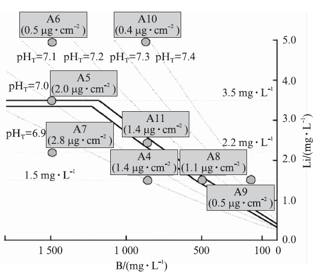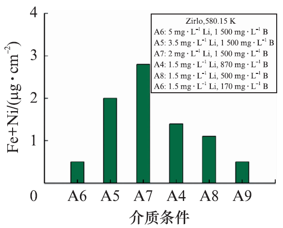 由图3可知,随着Li质量浓度从2.2 mg/L增加到5.0 mg/L时,Fe、Ni的沉积量从2.8 μg/cm2显著下降到0.5 μg/cm2。且由图3可知,试验中A7条件下,pHT为6.9,Fe、Ni的沉积量为2.8 μg/cm2。A10条件下,pHT为7.4,Fe、Ni的沉积量为0.4 μg/cm2。即随着pH上升,Fe、Ni的沉积量显著降低。该试验在添加了2 mg/L醋酸镍和醋酸亚铁的溶液中进行,溶液的pHT通过LiOH和H3BO3进行调节,试验时间为14天。为了进一步理清LiOH和H3BO3对Fe、Ni沉积影响的差异,WAN首先固定H3BO3质量浓度为1500 mg/L,改变Li含量(见图4,试验条件A6、A5、A7)。根据Fe、Ni沉积量的分析可知,随着Li浓度升高,沉积物中Fe、Ni的含量降低。已有文献报道表明,增加Li含量可将回路pHT从6.8升高至7.0,燃料包壳表面CRUD的沉积量将减少90%。A4、A8、A9条件下的试验结果(图4)表明,随着硼酸质量浓度从870 mg/L降至170 mg/L,Fe、Ni的沉积量显著降低。