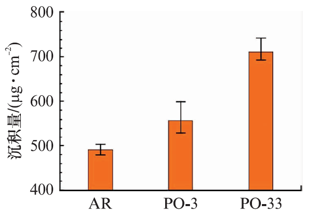由图9可知,A1-3试验条件下(20 mg/L的硝酸镍和硝酸铁)CRUD的沉积量为14.6 μg/cm2,在A2-3条件下(200 μg/L的硝酸镍和硝酸铁)CRUD的沉积量仅为1.4 μg/cm2。该结果表明,腐蚀产物浓度的增加,将会显著加速锆合金燃料包壳表面CRUD的沉积。该沉积试验分别在20 mg/L和200 μg/L的硝酸镍和硝酸亚铁混合溶液中进行,沉积时间为5天。A0代表溶液中未加入Ni和Fe。PARK研究了锆合金包壳材料经过表面氧化处理后CRUD沉积的差异。如图10所示,采用3种不同初始表面的锆合金包壳进行CRUD沉积试验:AR代表未经处理的包壳,PO-3和PO-33分别表示锆合金管外表面在电炉中400 ℃预氧化3小时和33小时。氧化完成后,PO-3和PO-33表面分别生成了厚0.71 μm和4.55 μm的氧化锆膜。将上述3种材料分别放入回路中,进行CRUD沉积试验。根据图10可知,相对于AR表面,PO-3表面的CRUD沉积量增加了14%,PO-33表面的CRUD沉积量增加了45%。