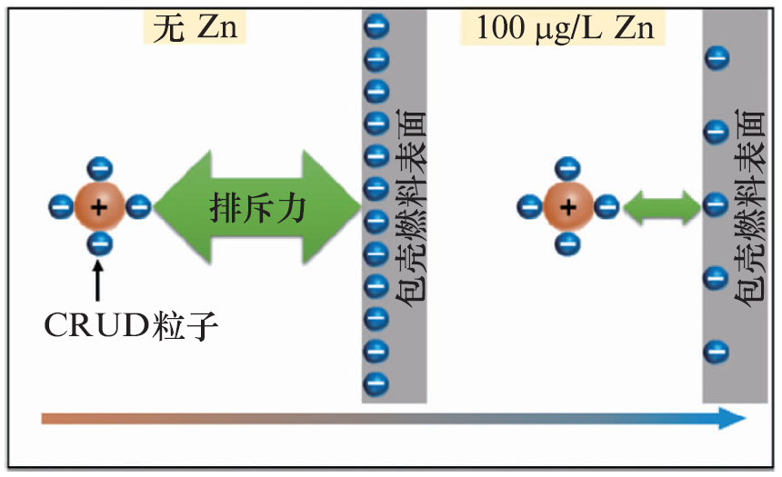 如图7所示,KIM试图用沉积颗粒与包壳表面的静电排斥力差异来解释CRUD沉积量不同的原因。在运行的水化学工况下,沉积颗粒和燃料包壳表面都带有负电荷。因此,当沉积颗粒靠近燃料包壳时,静电排斥力会阻碍颗粒物在包壳表面的沉积,且Zn含量越高,越阻碍CRUD沉积。