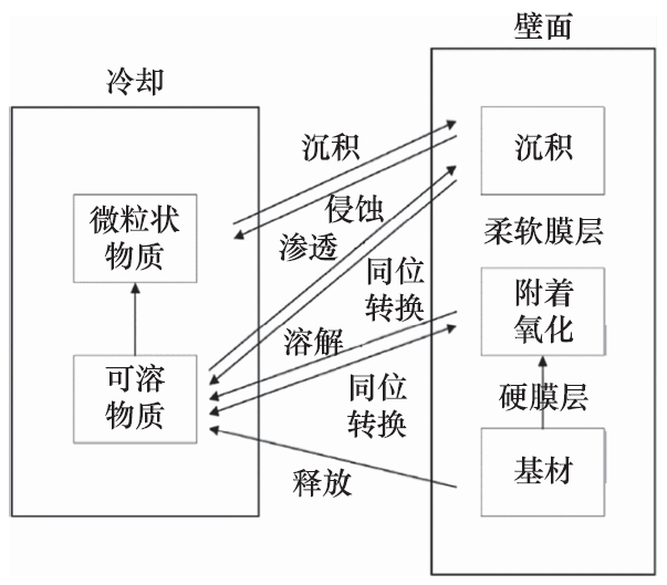 在压水堆核电厂一回路系统中,高温高压的水环境会使蒸汽发生器、主管道及压力容器等一次侧表面发生腐蚀,在材料表面形成氧化膜,高速流动的工作介质也可能将腐蚀产物以离子或颗粒态的形式释放到一回路冷却剂中,其中主要元素有Fe和Ni,这些腐蚀产物在一回路各区域中沉积,尤其是在核燃料包壳表面沉积,形成污垢(CRUD)。