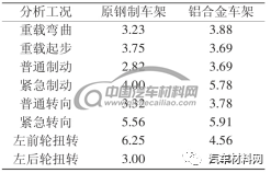经过仿真分析验证,综合方案1、方案2,铝合金车架刚度性能可以达到钢制车架水平,认为刚度能够满足性能要求。