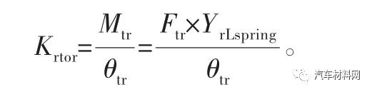 式中:Krtor为车架的后扭刚度,(N·m)/(°);Mtr为后扭工况的力矩,N·m;Ftr为后扭工况单边载荷,N;YrLspring为后板簧(中线)距离,m;θtr为后端扭转角,(°)。