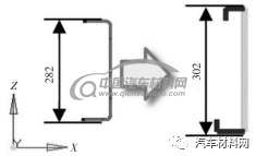 1)方案1。纵梁Z向截面尺寸增加,厚度优化、截面由U形改为C形,纵梁截面优化方案1如图2所示。