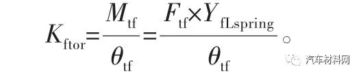 式中:Kftor为车架的前扭刚度,(N·m)/(°);Mtf为前扭工况的力矩,N·m;Ftf为前扭工况单边载荷,N;YfLspring为前板簧(中线)距离,m;θtf为前端扭转角,(°)。