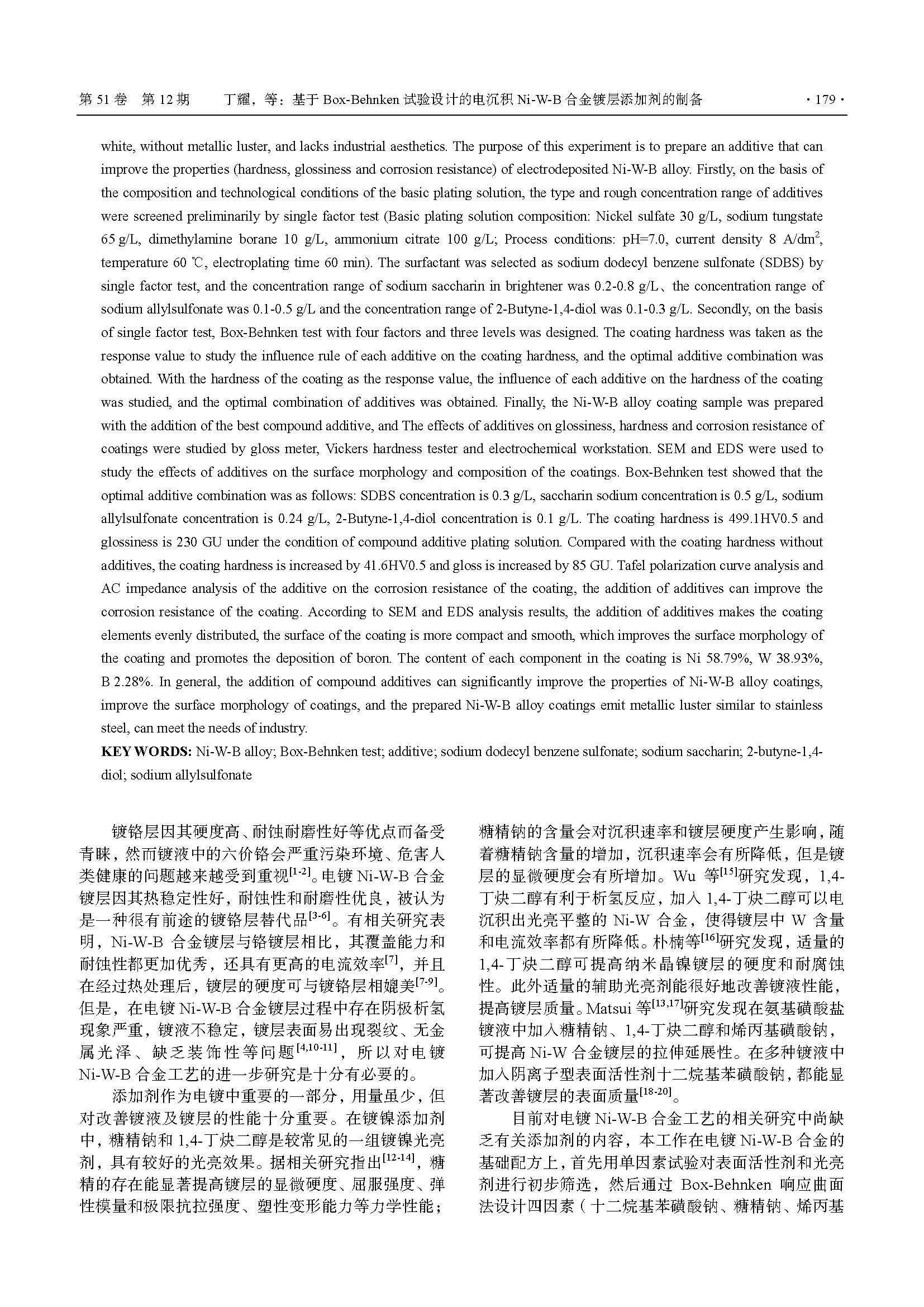 标签: Ni-W-B 合金, Box-Behnken 试验, 添加剂