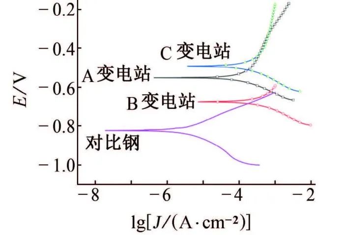 图5 在宜宾不同变电站大气环境中暴露一年后Q235碳钢在3.5% NaCl溶液中的极化曲线