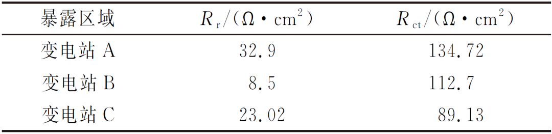 表2 在宜宾不同变电站大气环境中暴露一年后Q235碳钢在3.5% NaCl溶液中的Rr和Rct