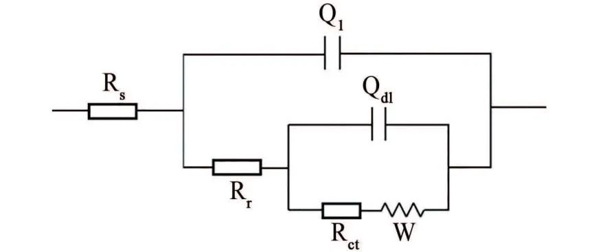 采用图7的等效电路对试样的电化学阻抗谱进行拟合。其中,Rs为溶液电阻,Q1为腐蚀产物层电容,Rr为电极表面腐蚀产物层电阻,Qdl为工作电极表面的双电层电容,Rct为工作电极表面反应的电荷转移电阻,W为腐蚀区域内基底金属的有效扩散层阻抗。