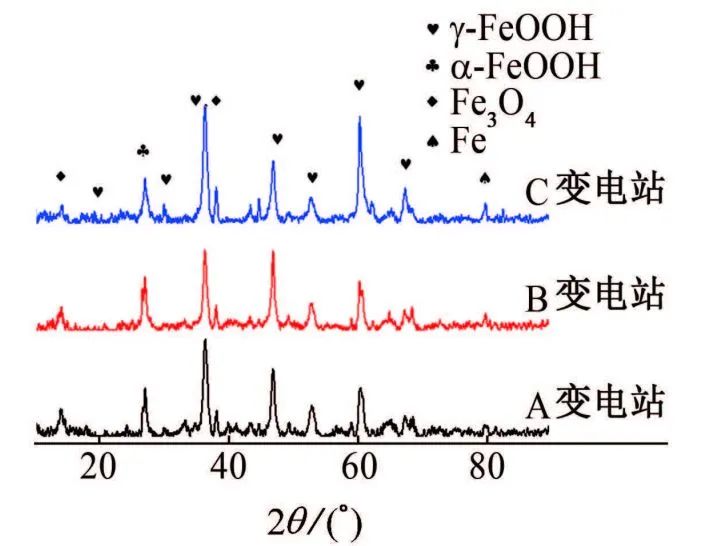 由图3可见,在三个地区暴露一年后Q235碳钢表面的腐蚀产物主要由α-FeOOH,γ-FeOOH和Fe3O4组成。通过半定量分析可知:在A变电站所处环境(城市气候)中,Q235碳钢表面腐蚀产物中γ-FeOOH含量最高;在重污染工业大气及轻工业污染大气(B变电站和C变电站)中,Q235碳钢表面腐蚀产物中α-FeOOH含量有所增加,说明在腐蚀过程中,生成的γ-FeOOH可转化为α-FeOOH和Fe3O4,锈层中α-FeOOH含量升高,这在一定程度上提高了锈层的保护性。