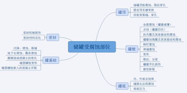 在高危的化工行业,如果我们不能及时的发现设备的腐蚀,后果便是一场场的事故,特别是各种高危介质的载体--储罐。那么,储罐的腐蚀一般发生在哪些部位?应该如何防范呢?储罐外壁接触大气,储罐周边的环境一般为石油化工企业,工业大气中含有二氧化硫、硫化氢、二氧化氮等有害气体,由于吸附作用、冷凝作用或下雨等原因,空气中的水汽或雨水在储罐外壁形成水膜,这种水中可能溶有酸、碱、盐类和其他杂质,会起到电解液的作用,使金属表面发生电化学腐蚀。因电解液层比较薄,所以外壁电化学腐蚀比较轻微,而且腐蚀也比较均匀。但在罐顶凹陷处、焊缝凹陷处、保温层易进水的地方、抗风圈与罐壁连接处以及其他易积水的地方,会形成较为严重的局部腐蚀。储罐内壁有两个重点腐蚀部位,分别是底部焊缝向上0-300mm的范围内的罐壁以及介质液位波动处(即油气交界面附近)。在介质中杂质的水分长时间沉积,在灌内形成积水,由于排水管的中心线一般比罐壁高约300mm,所以罐底始终有200mm-300mm的水存在,沉积水中含大量的氯化物、硫化物、氧、酸类物质等,形成较强的电解质溶液,产生电化学腐蚀,造成储罐内壁根部较严重的局部腐蚀。罐壁液位波动处,由于介质内和介质上部气象空间中的含氧量不同,可形成氧浓差电池而造成腐蚀。还可因液位处干湿状况频繁交替导致沉淀物的积聚而形成垢下腐蚀。在储罐进出料过程中,液位的变化及搅动作用,更加速了这两种腐蚀。储罐底板的介质侧一般腐蚀的会比壁板更加严重,有时甚至会腐蚀穿孔而出现泄漏现象。这些腐蚀主要源于灌内的沉积水,沉积水中的硫化物、氯化物、氧等物质会与金属发生反应,造成的电化学腐蚀。另外,在物料的注入部位,由于流体的冲刷,可能形成局部的冲蚀。立柱在灌装、提取、液流运动等正常状态下,都可能与底板发生摩擦和振动,这种机械磨损配合缝隙腐蚀,可导致立柱下底板的腐蚀穿孔。储罐底板的土壤侧的储罐底板的腐蚀比介质侧更加严重。边缘板是容易受腐蚀的部位,储罐基础如果没有有效的防渗水措施或防渗水材料老化失效,则雨水和水汽容易沿罐底板与罐基础的缝隙侵入到罐底的周边部位,进行腐蚀。由于储罐沉陷的不均匀,底板会高低起伏或有踏空现象。罐底板与基础的接触不良会导致罐底土壤的充气不均而形成氧浓差电池,造成罐底板的腐蚀。由毛细现象引起的水分侵入和由于水的存在而造成的微生物腐蚀。面对这些腐蚀,如果不加以防范,后果不堪设想。那么,我们应该如何去防范呢?定期检查与实时监测是比较常用的方法。储罐的整体腐蚀、重大缺陷一般可通过宏观检查和超声波测厚发现。其中宏观检测包括: