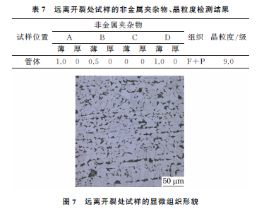 从远离开裂部位的管道上截取试样,依据ASTM E3-11(2017) 《金相试样制备标准指南》,ASTM E45-18a 《钢中夹杂物含量的测定———标准检验法》,ASTM E112-13 《平均晶粒度测定的标准试验方法》,用光学显微镜观察试样,结果如表7(表中F为铁素体,P为珠光体)及图7所示。
